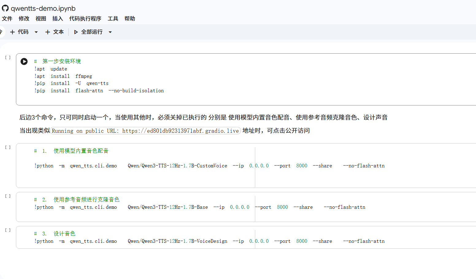 🔗 复制该地址浏览器中打开 Qwen-TTS 云端笔记本: https://colab.research.google.com/gist/jianchang512/3be479157d50c4ccd2de73c146e80245/qwentts-demo.ipynb