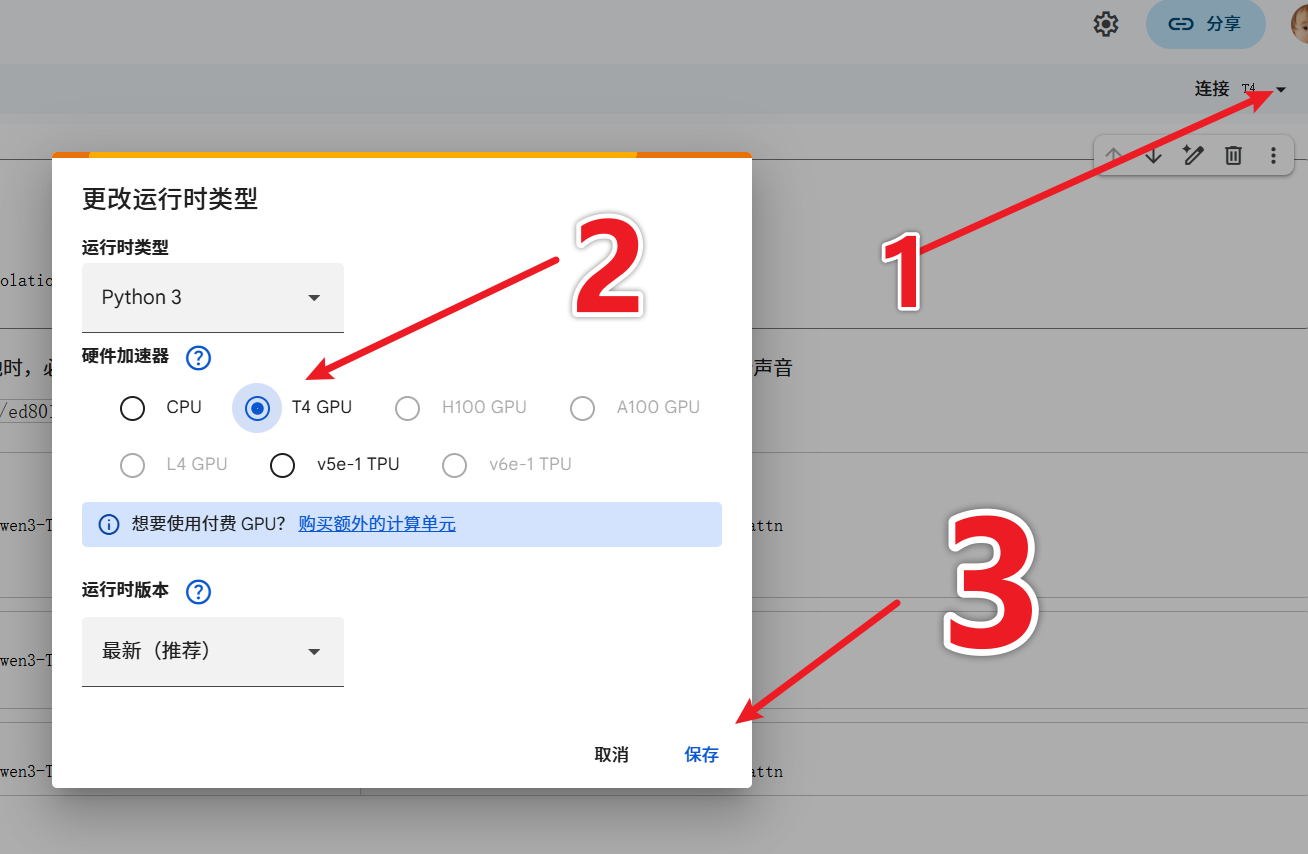 - 在弹出的窗口中,硬件加速器 一定要选择 【T4 GPU】。