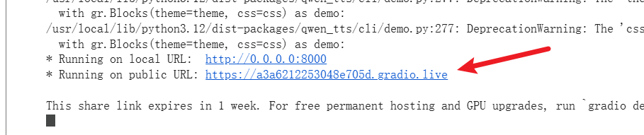 等待几十秒后,底部的日志里会出现一个以 gradio.live 结尾的链接(例如 Running on public URL: https://xxxx.gradio.live)。