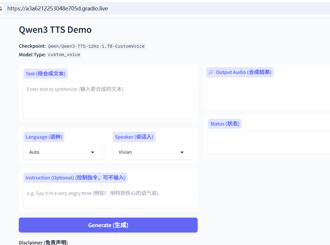 - Reference Audio (参考音频): 在左侧直接把你想模仿的声音文件(比如 mp3/wav)拖进去。只需要几秒钟清晰的人声即可。
