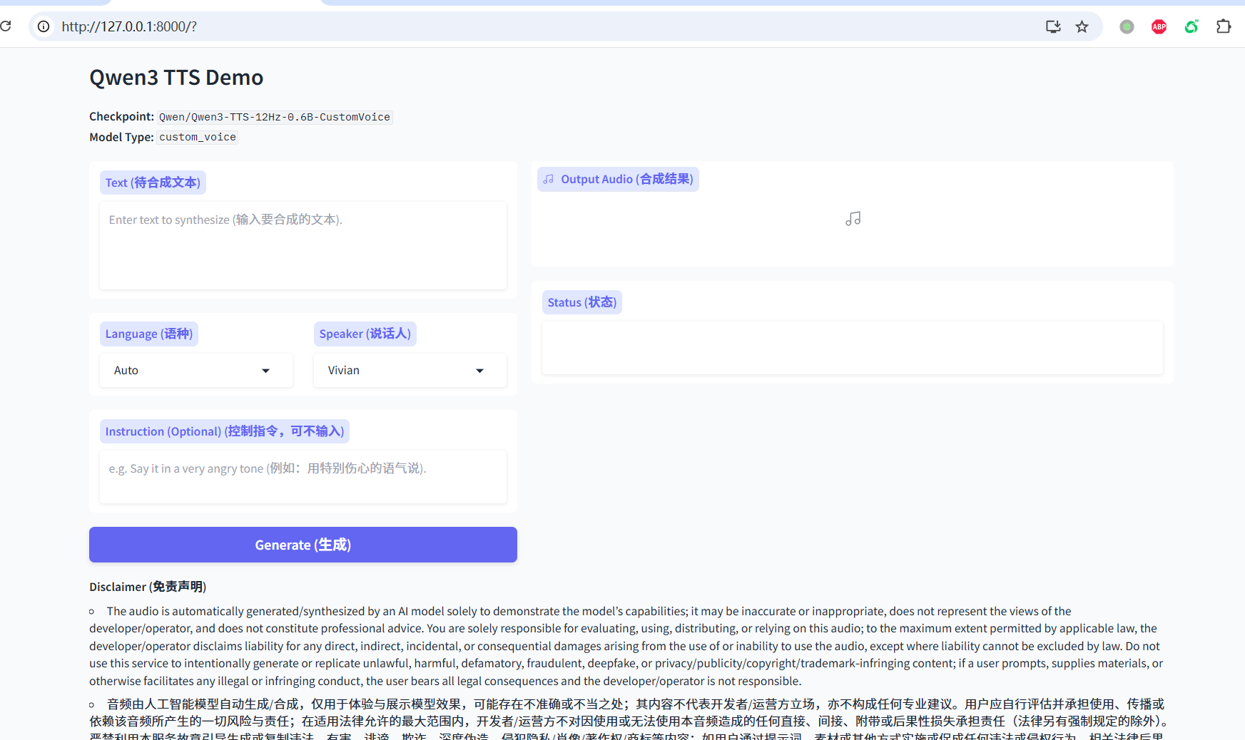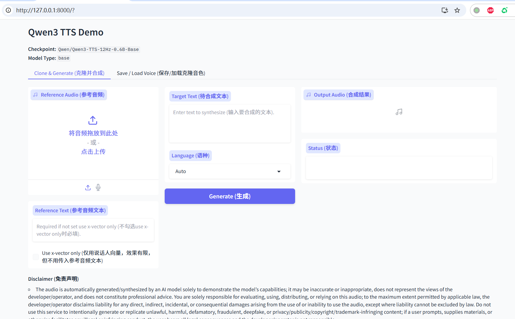 http://127.0.0.1:8000并回车。 - 你将看到 Qwen3-TTS 的操作界面: