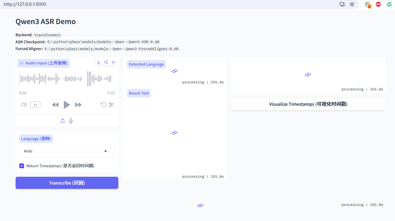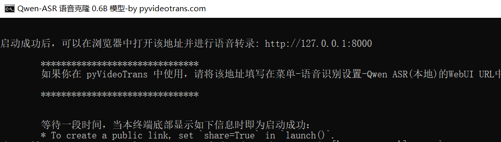 http://127.0.0.1:8000填入 pyVideoTrans 软件的菜单-语音识别设置-Qwen-ASR(本地)--WebUI URL中