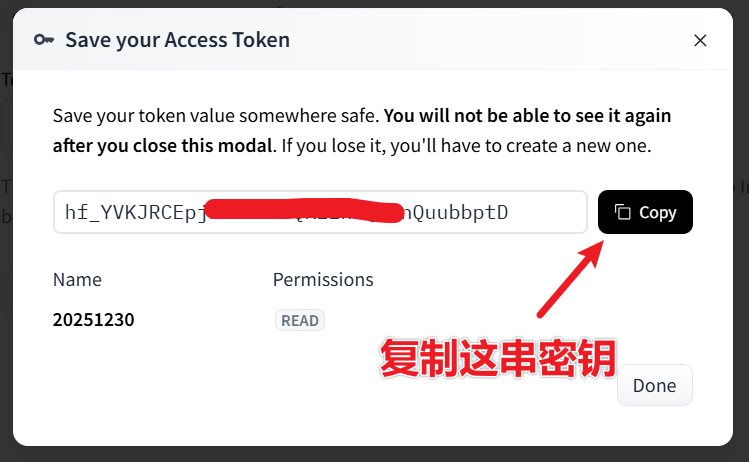 - 然后访问这个网址:https://huggingface.co/settings/tokens/new?tokenType=read 随意填写一个英文名字,点击