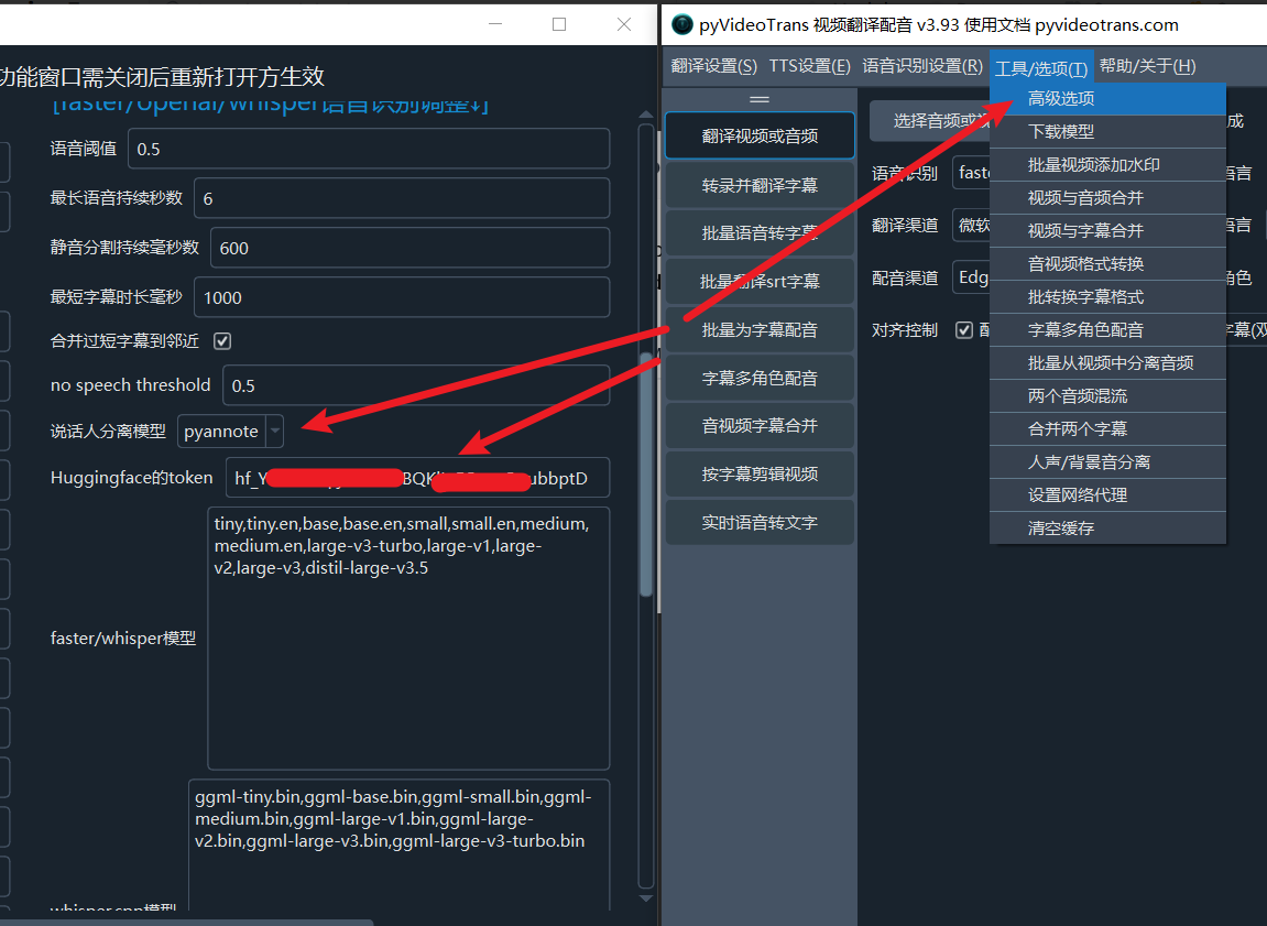 pyannote,并在Huggingface token中填写你刚刚复制的密钥,如下图