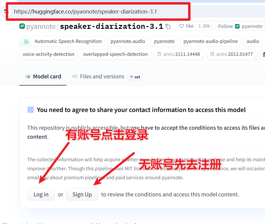 确认你能访问 https://huggingface.co/pyannote/speaker-diarization-3.1 网站(该站国内已被墙),并拥有一个账号,如果没有,请免费注册并登陆