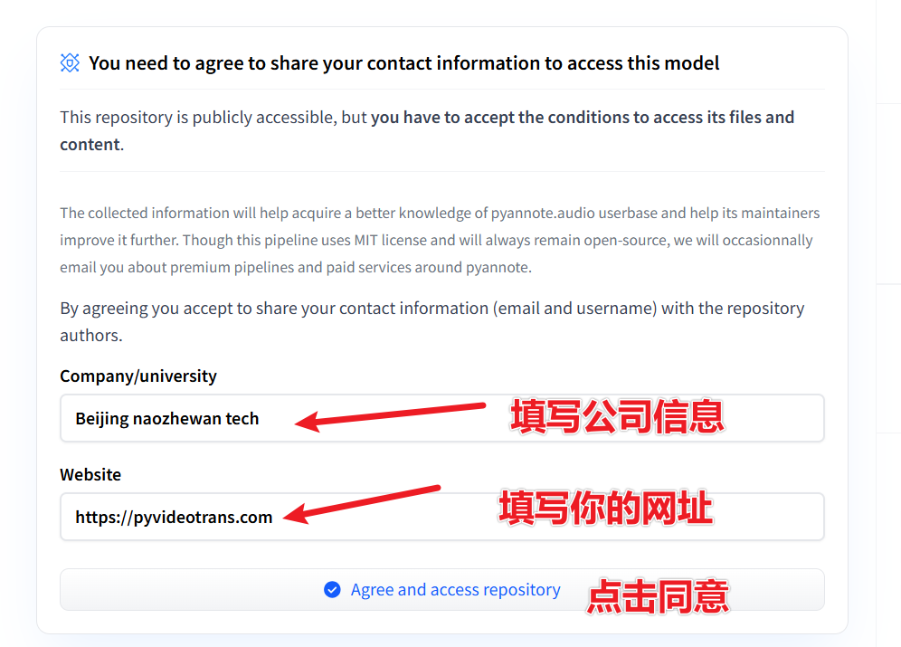 登录并打开该网址: https://huggingface.co/pyannote/speaker-diarization-3.1 ,如图填写相关信息,然后点击