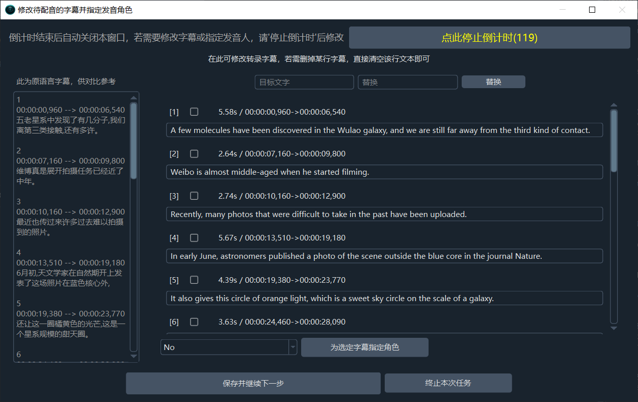 Subtitle and voice role editing window pops up after the subtitle translation stage is complete