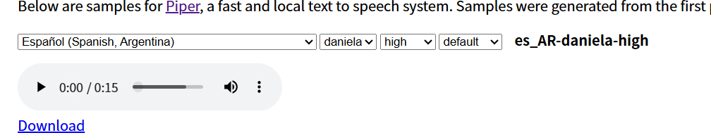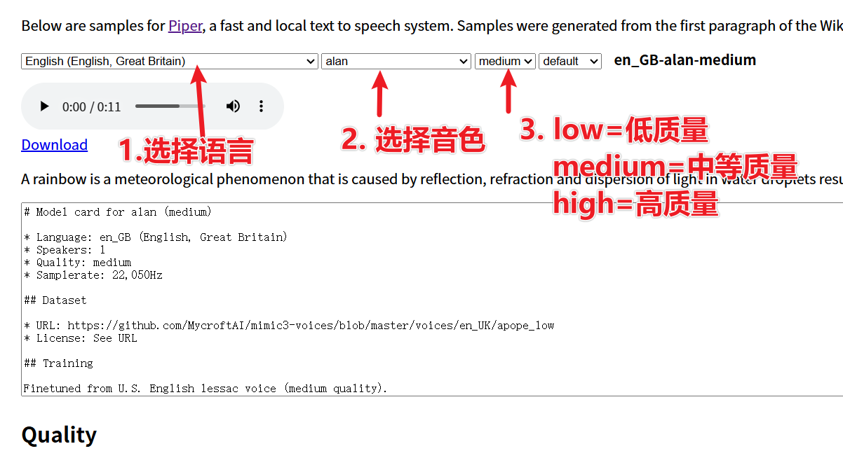 如图,先选择语言,再选择某个声音,然后选择音质,点击播放器试听,满意的话,点击Download跳转到模型下载地址