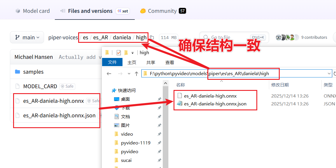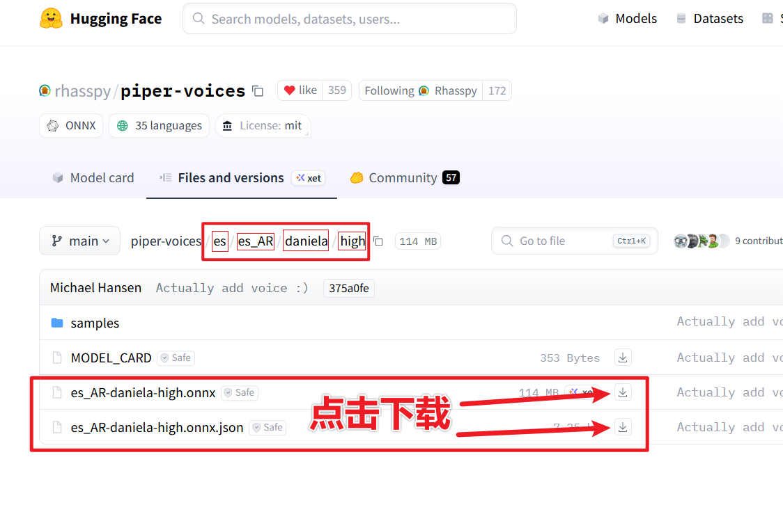 点击Download按钮,会打开该模型下载页面,其中显示的es_AR-daniela-high.onnx和es_AR-daniela-high.onnx.json就是所需的2个模型文件,只需要下载他们2个就行,同时注意上面4个标红的目录结构,如下图