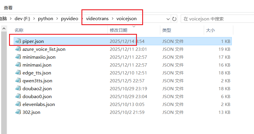 此时还无法在软件内查看新增的音色,需要打开 sp.exe 同目录下的videotrans/voicejson 文件夹,删掉piper.json文件,注意仅仅删除这一个文件,不要删除其他文件。