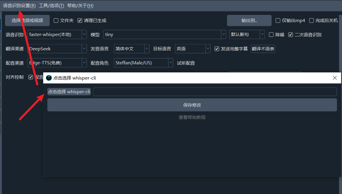 点击 pyvideotrans 菜单--语音识别设置--Whisper_CPP--点击选择 whisper-cli,找到你解压后的 whisper-cli.exe 文件,然后保存