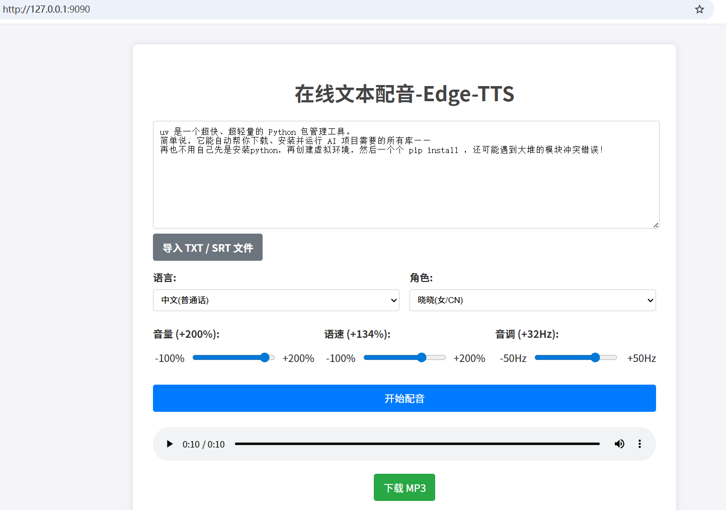 - 开始配音: 点击这个大大的按钮,稍等片刻,生成的音频就会在下方出现播放器并自动播放。