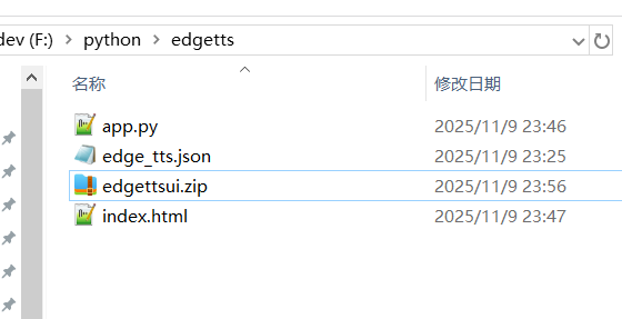 app.py:这是我们配音服务的“大脑”,负责处理配音逻辑。index.html:这是服务的“操作界面”,也就是你在浏览器中看到的网页。edge_tts.json:这是一本厚厚的“角色菜单”,里面定义了所有可用的语言和声音选项。