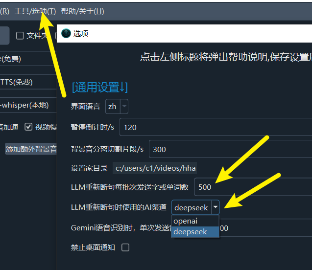 中调整数值,默认每 500 个字或单词发送一次断句请求,该值越大,断句效果越好,但如果输出超过了所用模型允许的最大输出token,会引发错误。同时若增大该值,也需要相应调大下条所述的最大输出token