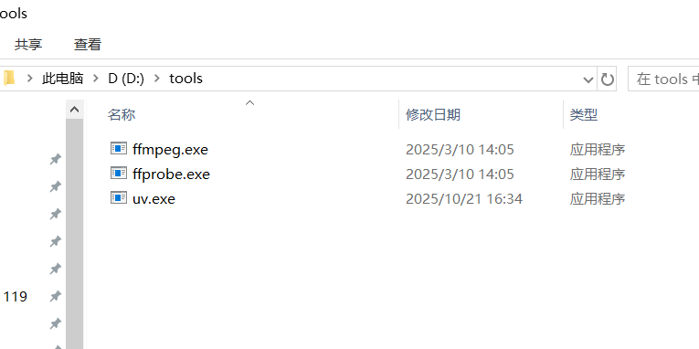 首先,请确保你已经下载并解压了相关工具。 假设你将 uv.exe 和 ffmpeg.exe 统一存放到了 D:/tools 文件夹下,如下图所示:
