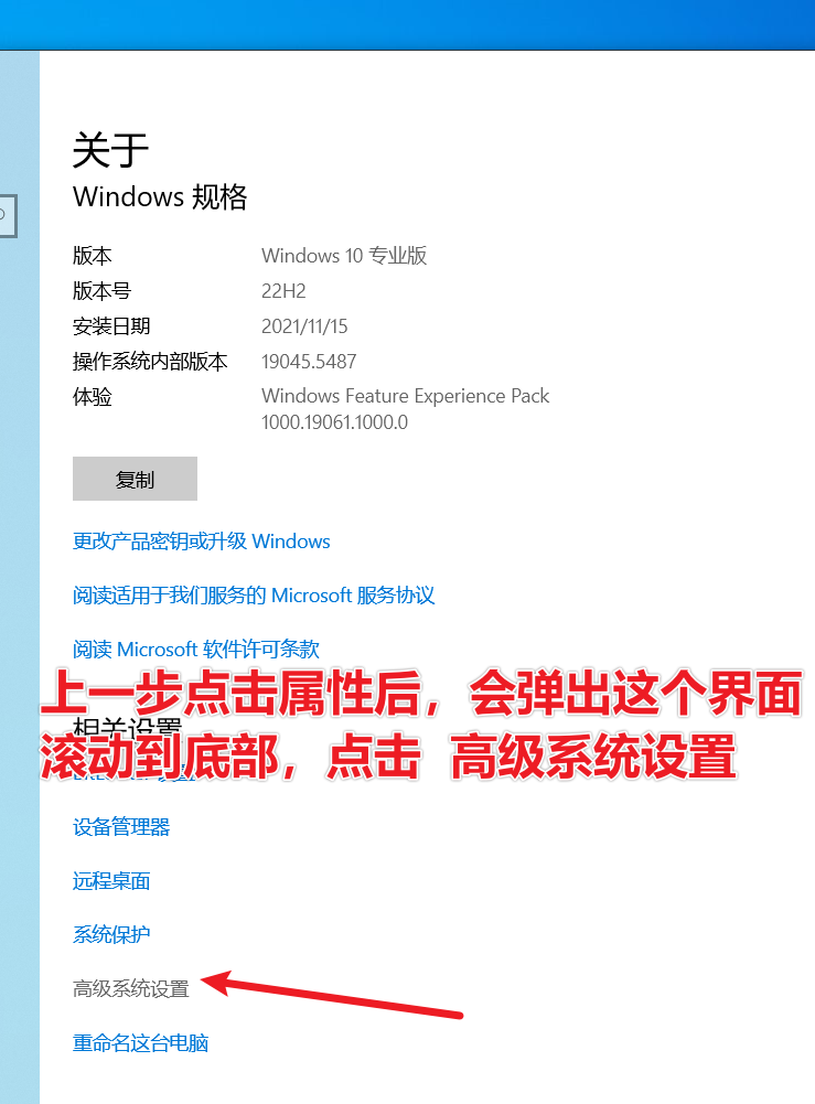 2. 进入高级设置 在弹出的设置面板中,向下拉到底部,找到并点击【高级系统设置】。
