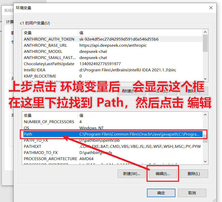 4. 编辑 Path 变量(关键步骤) 在下方的“系统变量”区域中,找到名为 Path 的一行,选中它,然后点击【编辑】(或者直接双击 Path 这一行)。