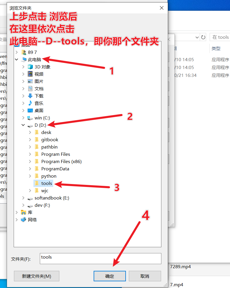 6. 定位文件夹 在浏览框中,依次展开 此电脑 -> D盘 -> tools(或者你存放 exe 的那个文件夹),点击确定。