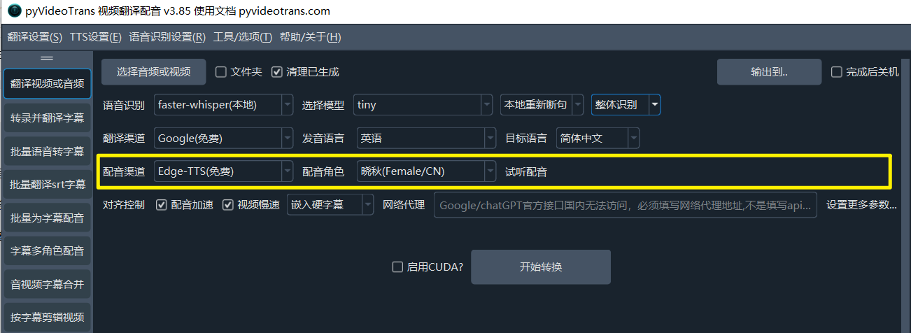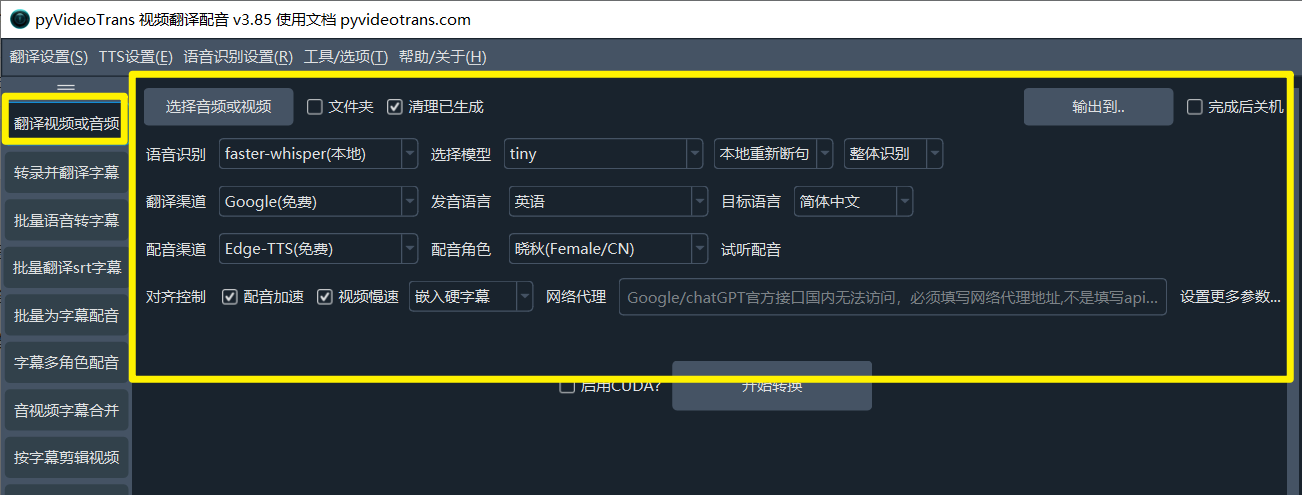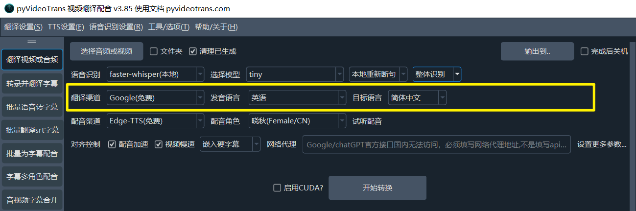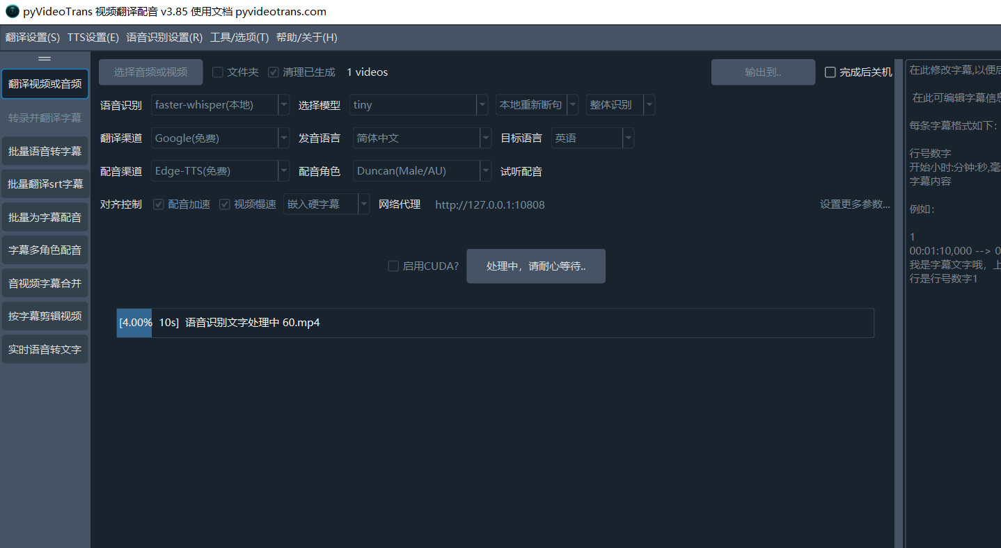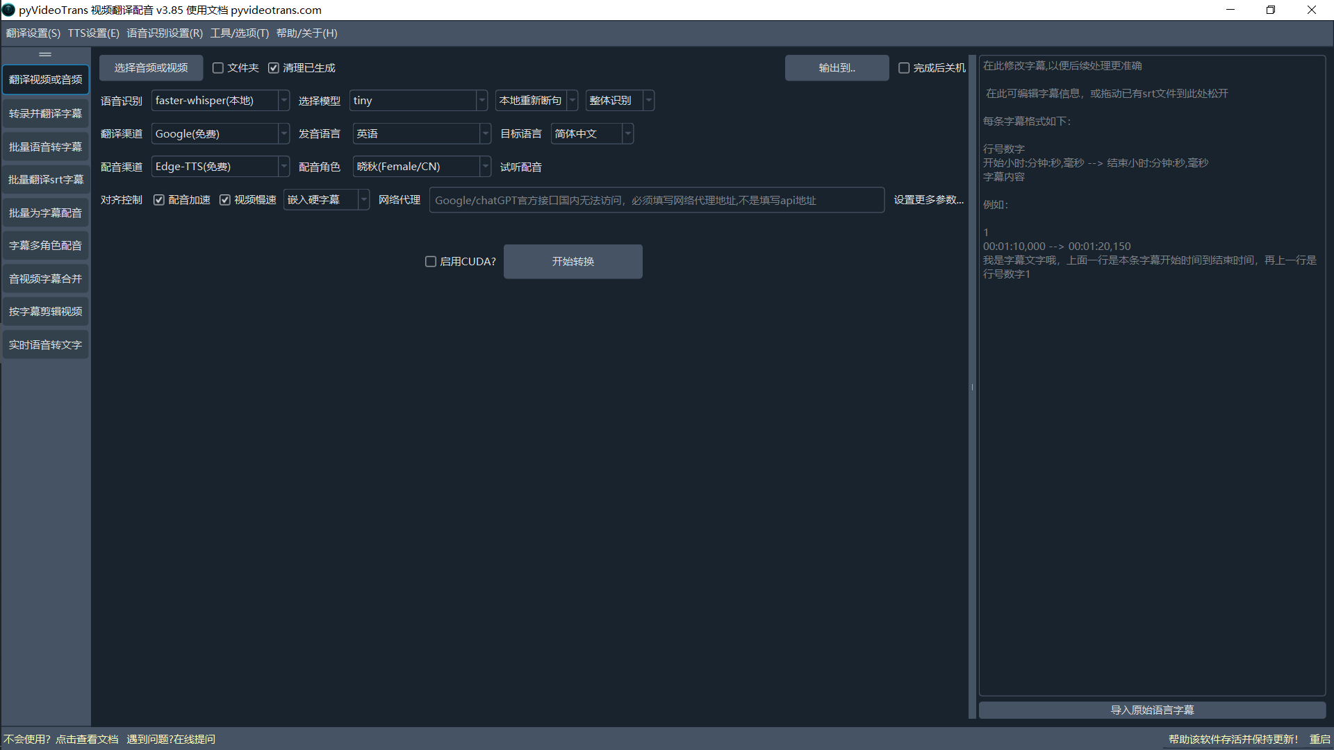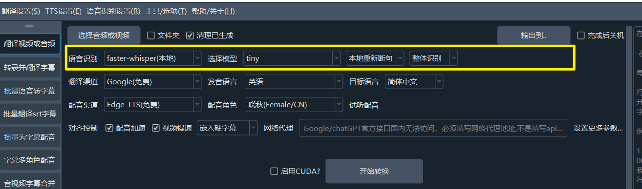 - CUDA加速:在Windows和Linux上,如果您有 NVIDIA 显卡并正确安装了 CUDA 环境,请务必勾选此项,它能将语音识别的速度提升数倍甚至数十倍。