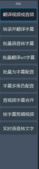 - 左侧功能区:切换软件的主要功能模块,如 翻译视频和音频 、 转录并翻译字幕 、音频视频转字幕、批量翻译srt字幕、批量为字幕配音、字幕多角色配音、音视频字幕合并、按字幕剪辑视频、实时语音转文字等。