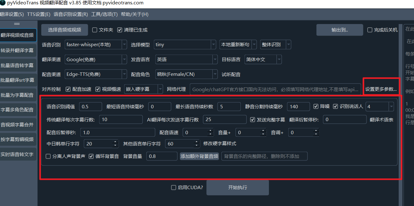 如果你还想进行更精细的控制,例如语速、音量、每行字幕字符数、降噪、说话人识别等,可以点击 设置更多参数...,点击后如图