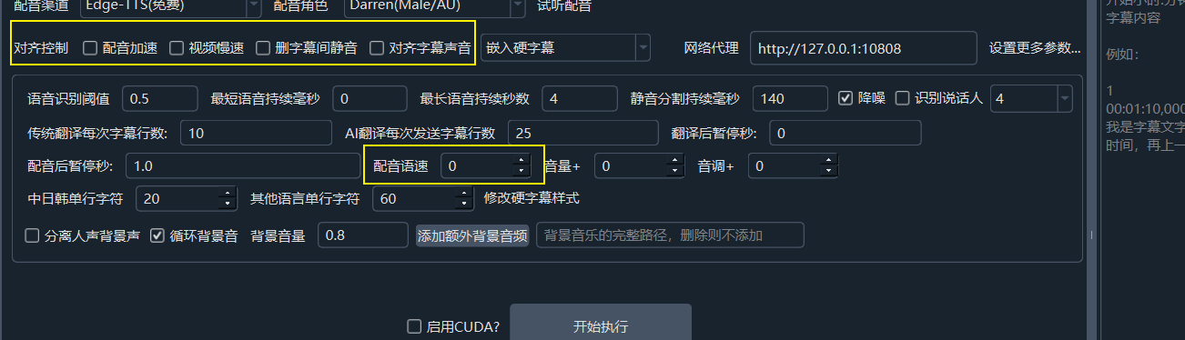 配音加速:设置用于自动增加配音时长以匹配字幕;