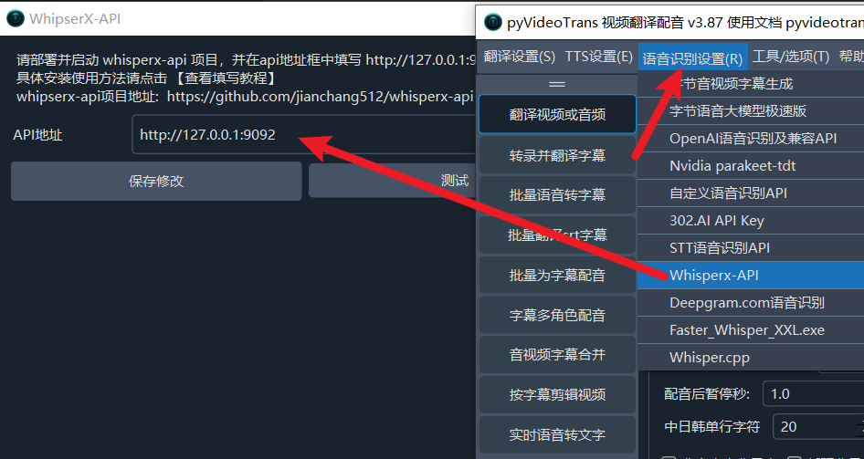 将该地址http://127.0.0.1:9092填写到 pyVideoTrans--菜单--语音识别设置-whipserxAPI窗口的API地址文本框内即可
