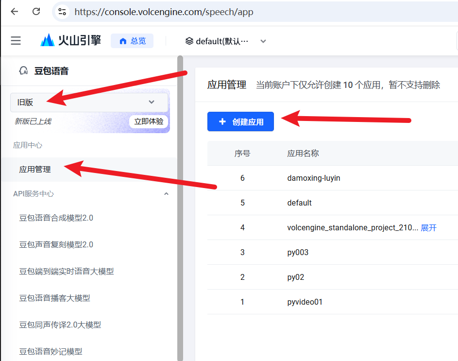 上步登陆并实名认证后,打开该地址进入应用创建管理( https://console.volcengine.com/speech/app ),请再次确认左上角是使用的旧版。