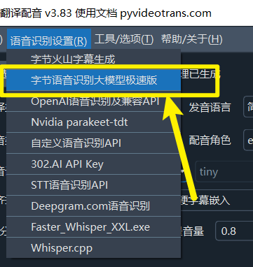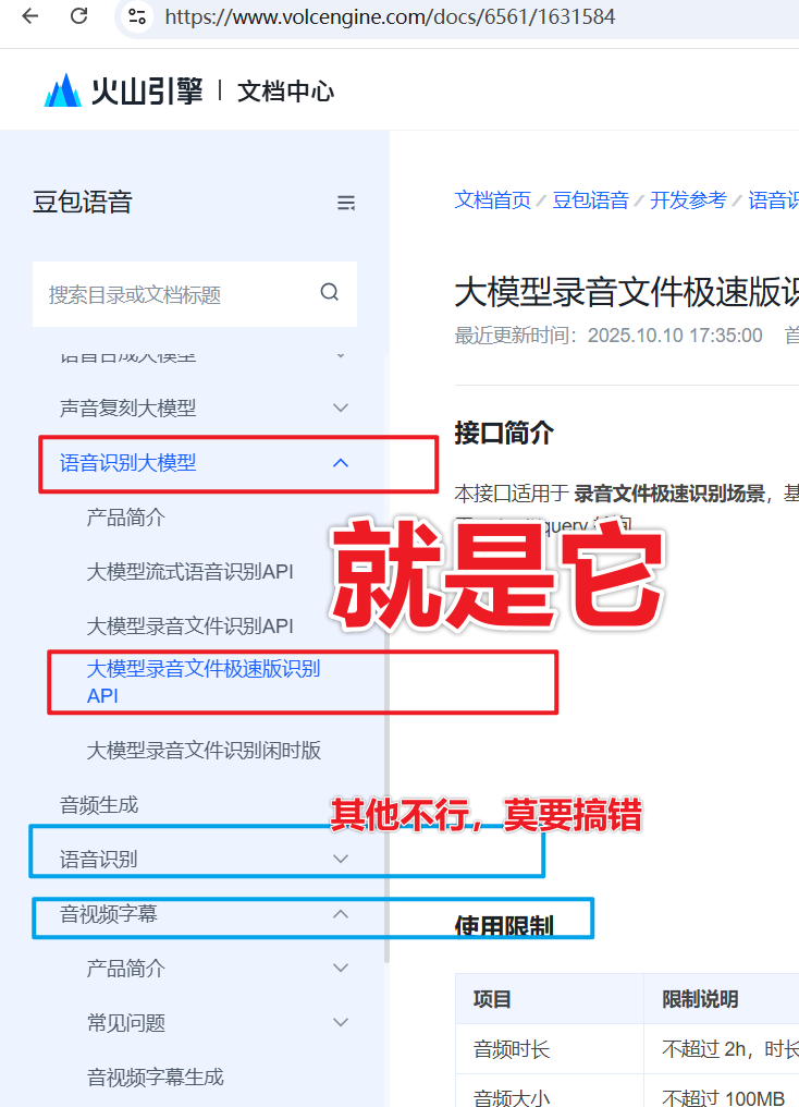 字节语音识别大模型极速版,和字节火山字幕生成渠道不是一回事。另外字节火山中有一大堆名称类似的各种语音识别服务,必须使用指定的这个