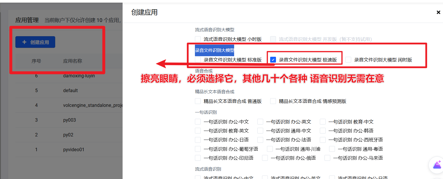点击 "创建应用",名字填写英文,描述随意,重要的是下方的一堆复选框,选中录音文件识别大模型--录音文件识别大模型 极速版,这是必须的,其他均可以不选。