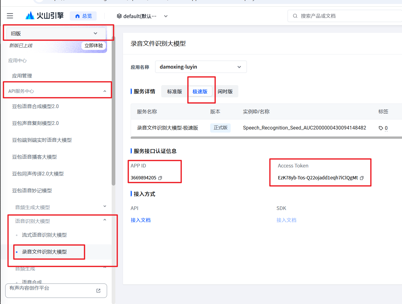 请再次确认左上角是旧版,然后左侧菜单依次打开API服务中心--语音识别大模型--录音文件识别大模型,选择的产品若不对,肯定无法正常使用。